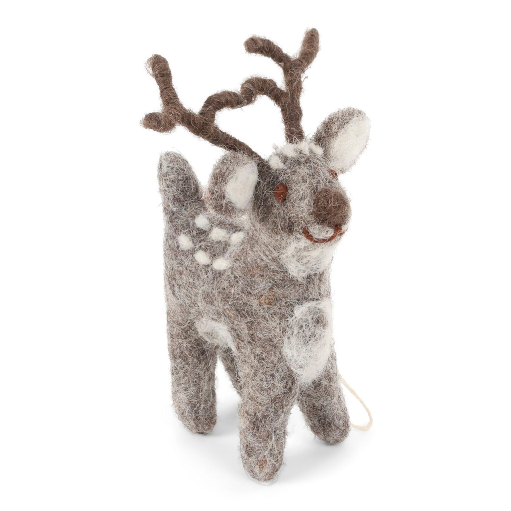 Dit delicate grijze hert, klein maar vol charme, is de perfecte aanvulling op je winterdecoraties. Met liefde handgemaakt, legt het de stille magie van een besneeuwd bos vast.