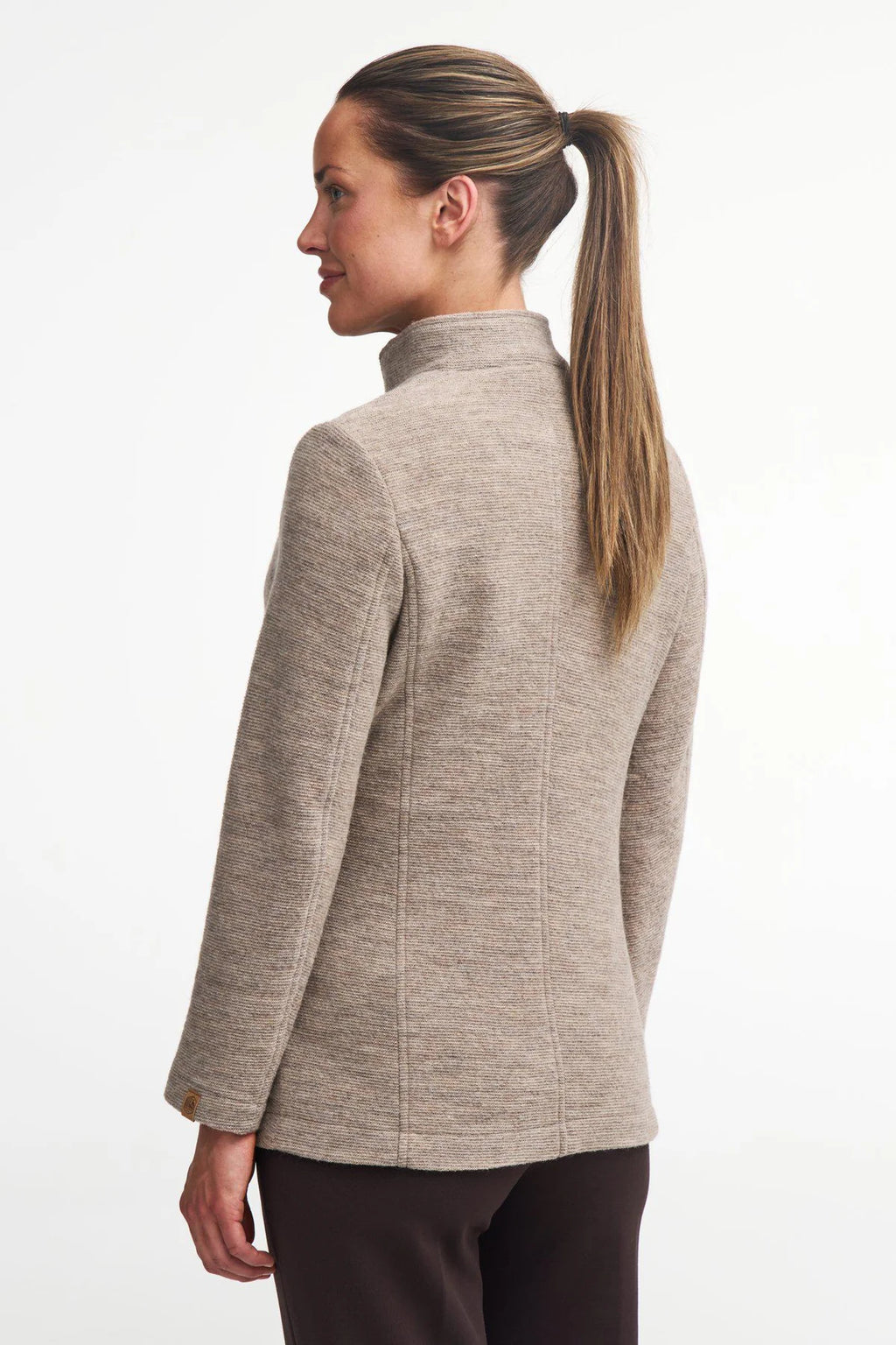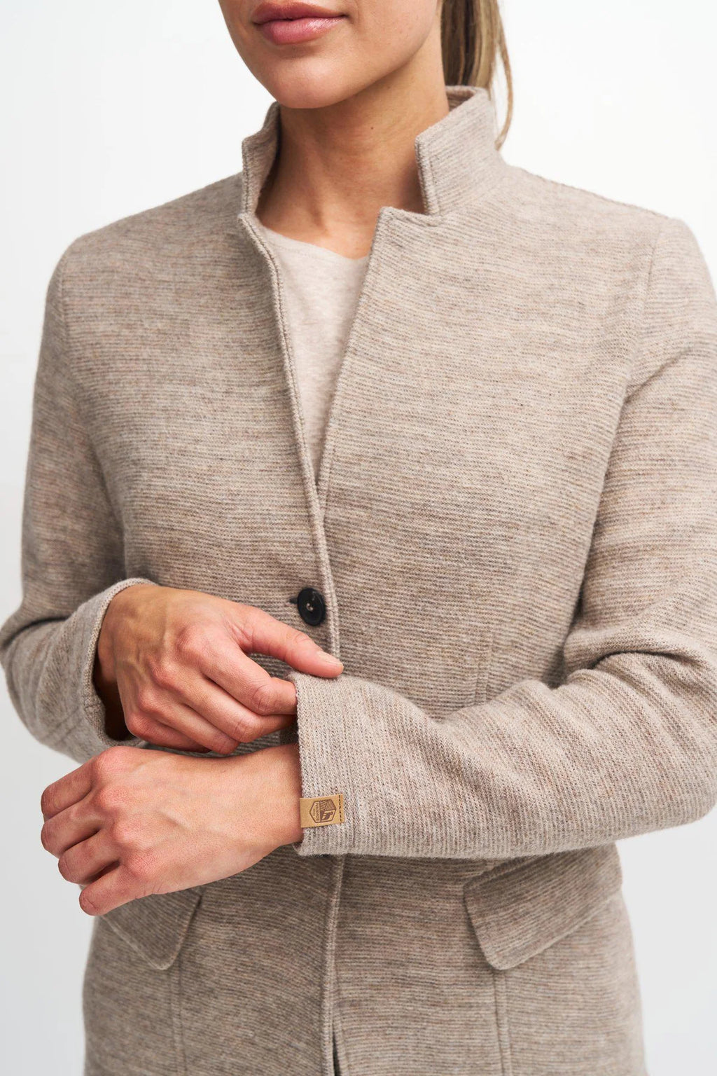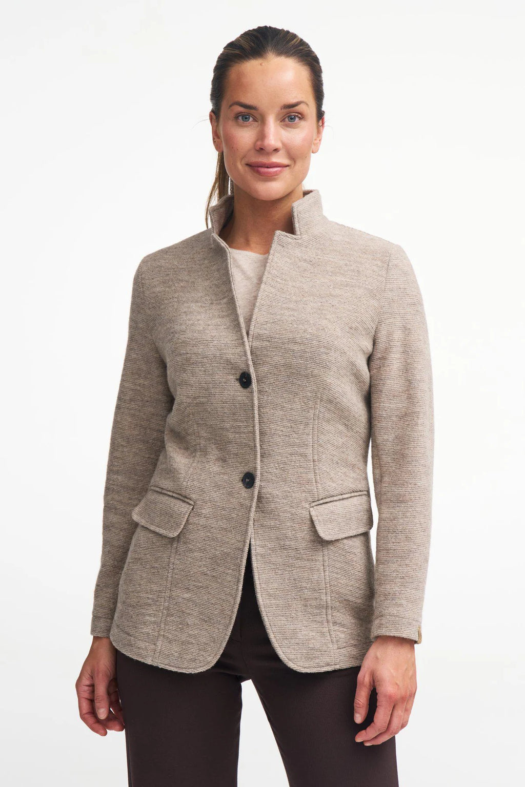 Een stijlvol en vrouwelijk jasje met een luxueuze uitstraling en prachtige pasvorm. Dit verfijnde model is gebreid van 100% gekookte wol – dun, maar warm en comfortabel. De twee knopen aan de voorkant zijn gemaakt van gerecycled papier, en de zijzakken met klep geven het jasje een nette, klassieke look.