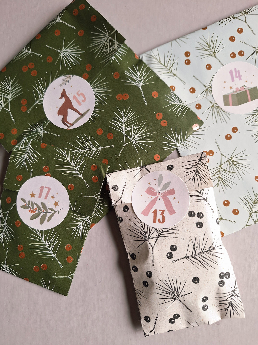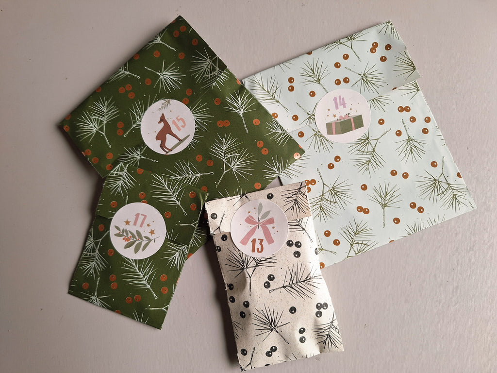 In deze papieren cadeautas vind je 24 cadeauzakjes met iets leuks.