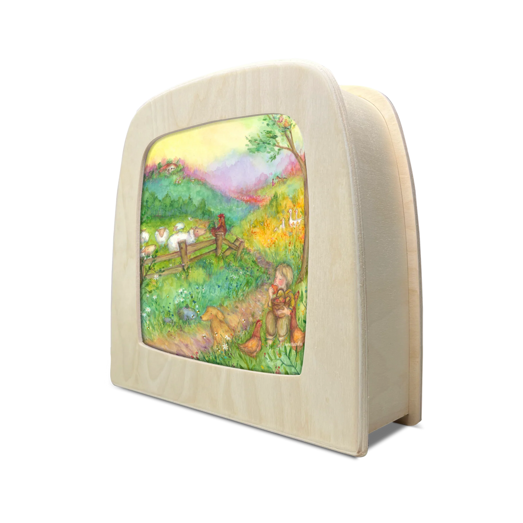 Haar tekeningen ontstaan met aquarel en potlood en zijn speciaal gemaakt om te stralen in het zachte licht van de Toverlux lamp of in de raamhanger.
